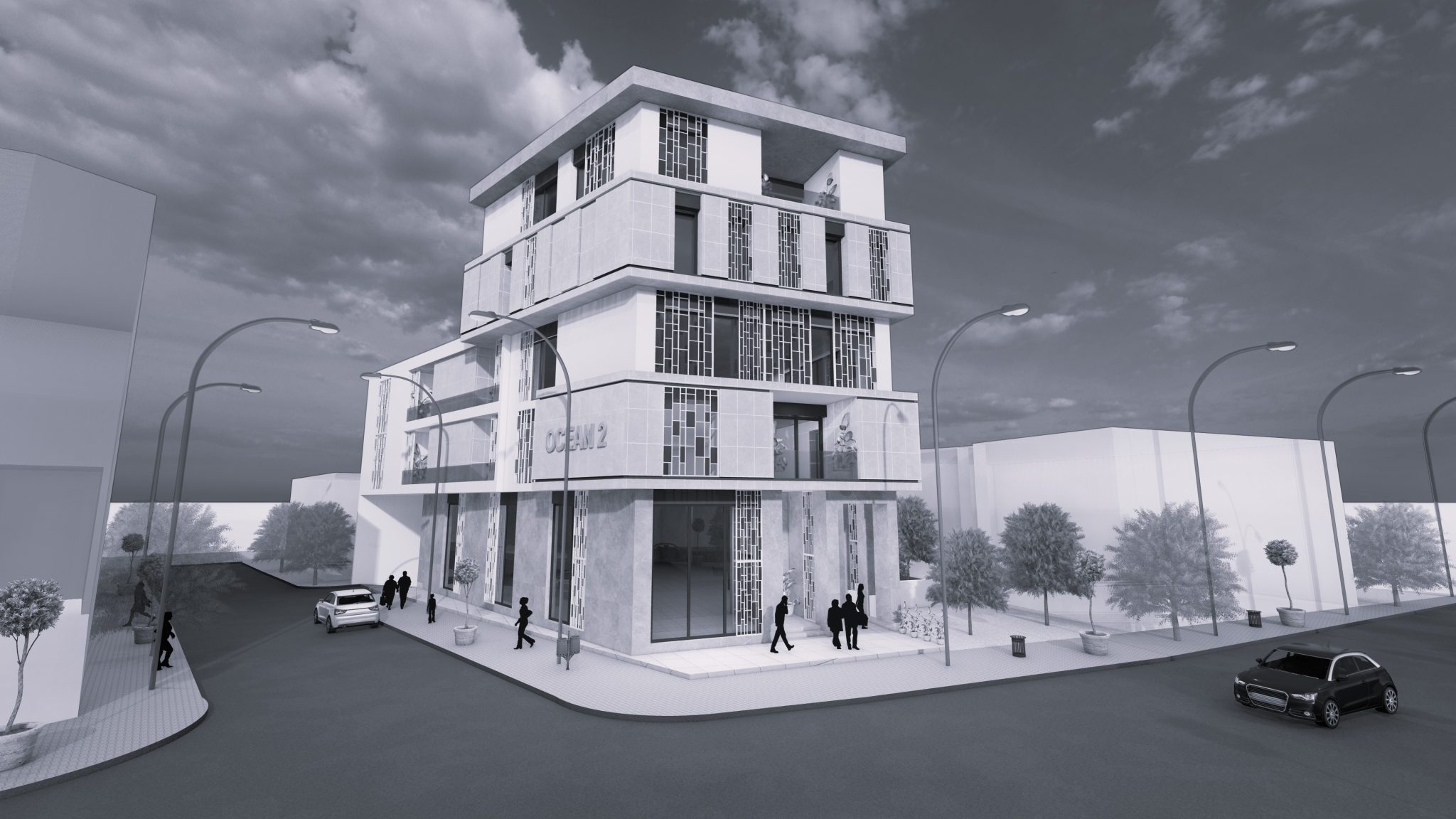 L’immeuble Océan 2, situé à Ariana, Tunisie, représente un projet mixte d’une superficie totale de 3 200 m². La conception de cet immeuble polyfonctionnel en R+4 vise à intégrer harmonieusement des espaces dédiés au commerce, aux bureaux et à l’habitation. L’immeuble se distingue par deux blocs connectés par une passerelle, l’un dédié à l’habitation et l’autre au commerce et aux bureaux. Le projet est caractérisé par une forme de terrain irrégulière dans un angle donnant sur deux voies, avec des bureaux offrant des vues panoramiques sur la ville.