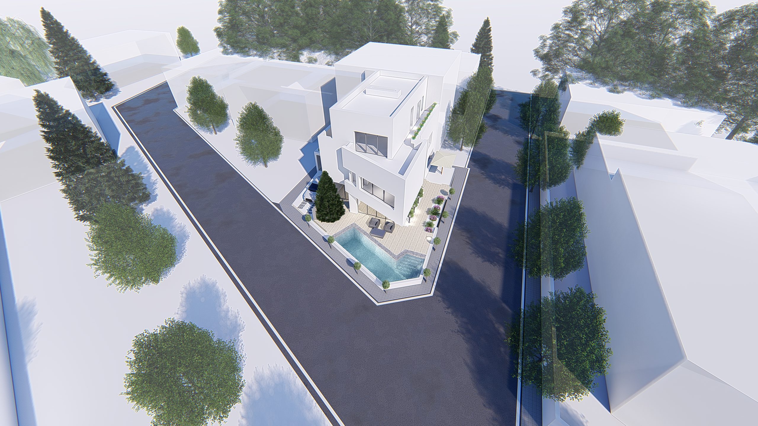 La villa O est une villa jumelée, localisée à Ain Zaghouan, elle est construite sur une surface de 350 m² avec une architecture moderne en R+2. Érigée sur un terrain trapézoïdal, la particularité de ce projet consiste à la forme des volumes qui sont conçus pour épouser la forme de terrain. La bonne orientation coïncide avec le jardin ce qui a permis de créer la piscine à l’angle du terrain afin de cadrer les ouvertures vers cet espace central.